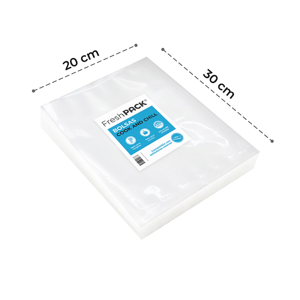 Bolsa Lisa Cook and Chill 70 micras. Sirven para ser utilizadas con selladoras de vacío profesionales de campana. Hechas para refrigerar, congelar, utilizar en microondas y cocinar (Sous Vide y/o baño maría). Las bolsas FreshPack están hechas de varias capas de material resistente a la abrasión y temperaturas extremas.
